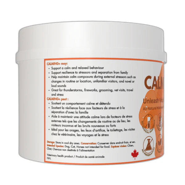 - Helps maintain calm composure during external stressors such as novel or loud sounds like thunderstorms or fireworks, changes in routine or location, unfamiliar visitors, grooming, vet visits and travel