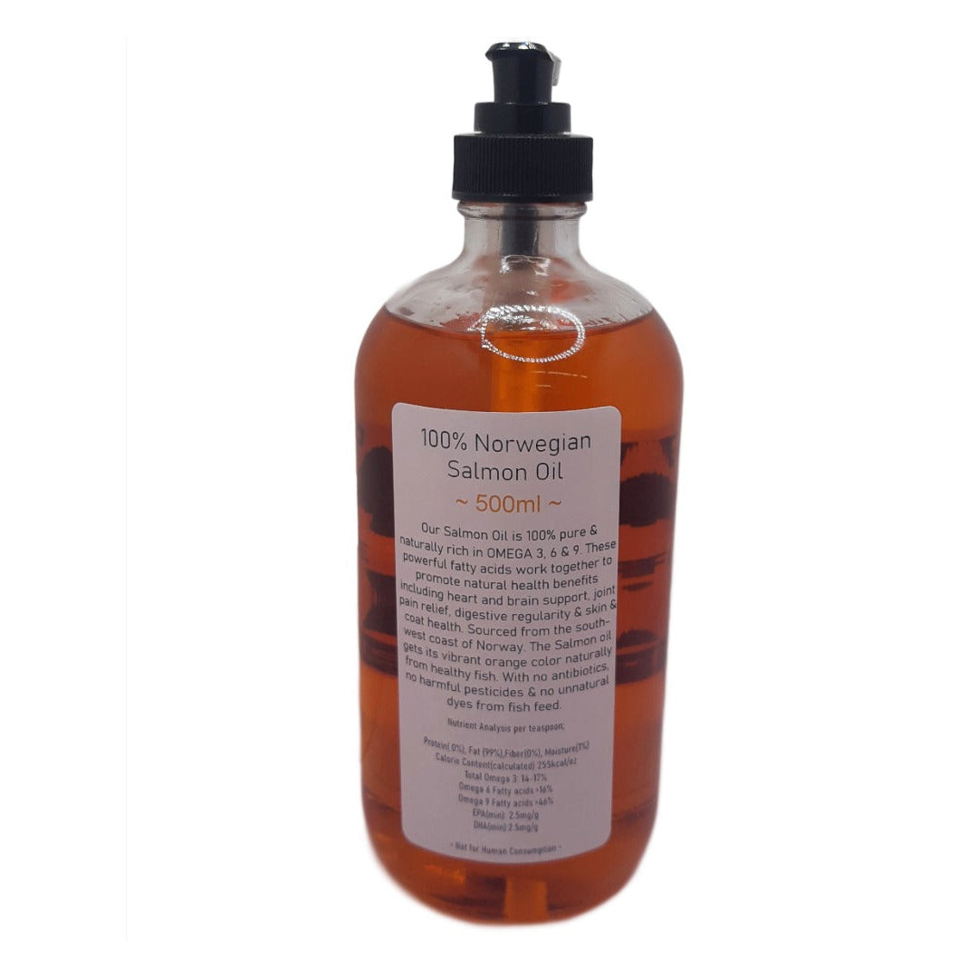 Norwegian Salmon Oil is 100% pure & naturally rich in OMEGA 3, 6 & 9. These powerful fatty acids work together to promote Natural health benefits including heart and brain support, joint pain relief, digestive regularity, along with skin & coat health. We source our ingredients thoughtfully to help your pet thrive. Our Salmon oil gets its vibrant orange color naturally. With no antibiotics, no harmful pesticides & no unnatural dyes from fish feed.
